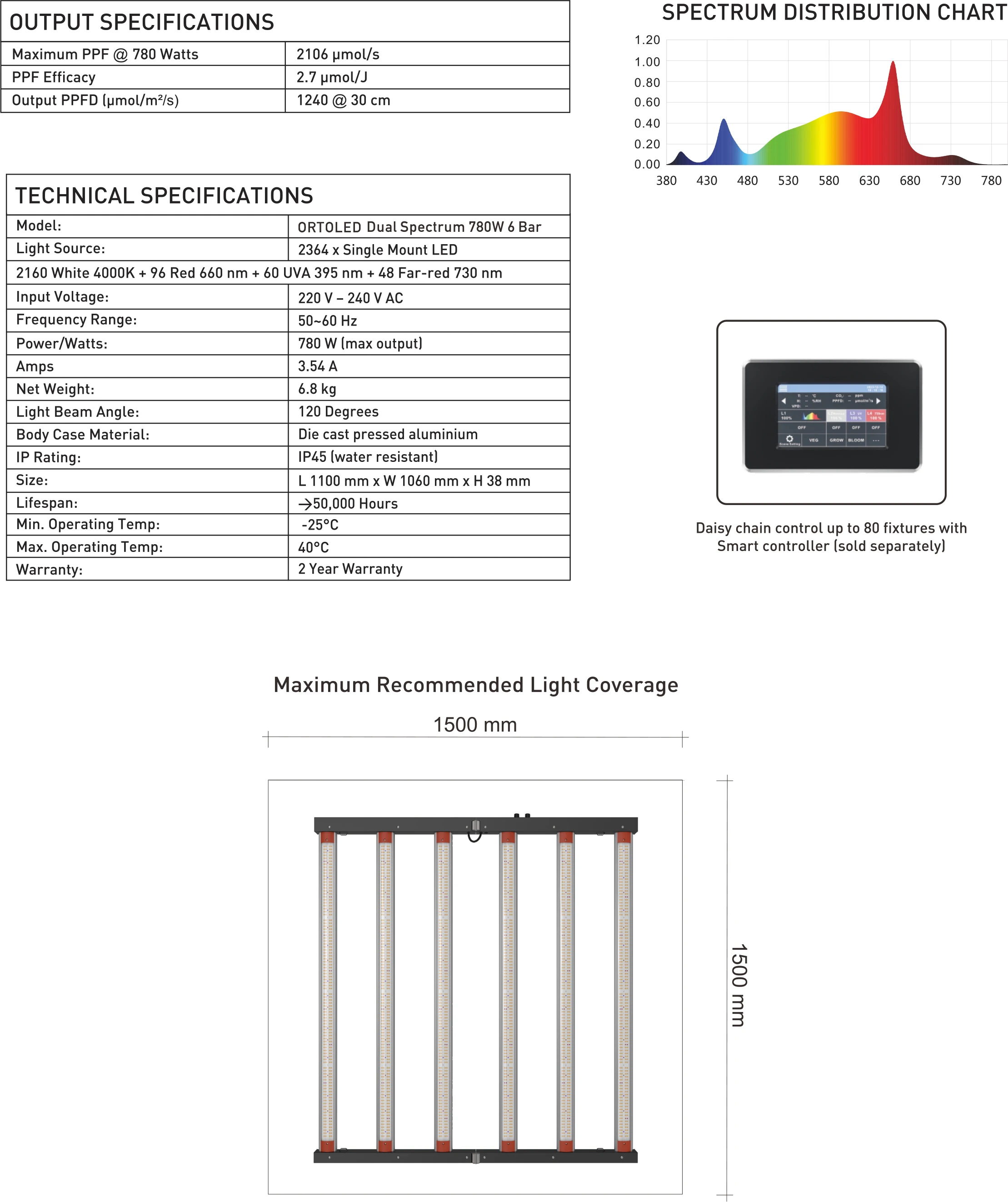 Specifiche principali Ortoled S Line HL780w with dual spectrum (White + Deep red 720W) + UV/FR 60W 2,7 µmol/J:
